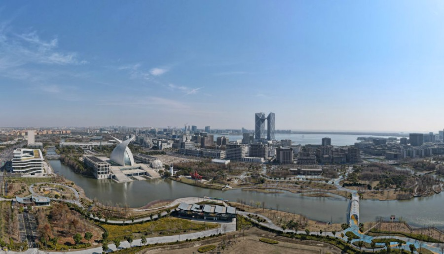 這是2025年3月19日拍攝的上海自貿(mào)試驗(yàn)區(qū)臨港新片區(qū)滴水湖畔景色(無人機(jī)照片)。新華社記者 方喆 攝